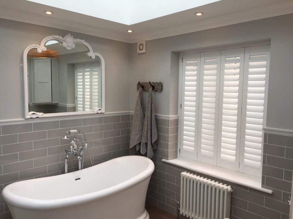 The off white window shutters over tub contribute to the bathroom’s contemporary aesthetic. They also evoke a sense of security.