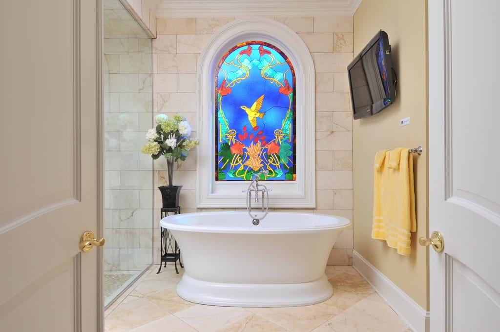 Furthermore, white arched window lends the area a visual interest. Since it is stained, it adds texture and pops of color to the scene.