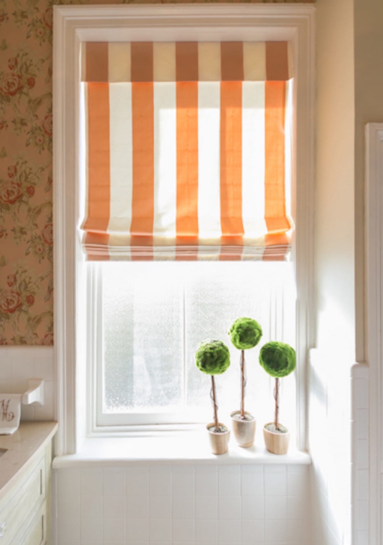 The orange-and-white Roman shade is not just visually pleasing, but also provides privacy whenever needed. Faux potted plants lend color to the zone.