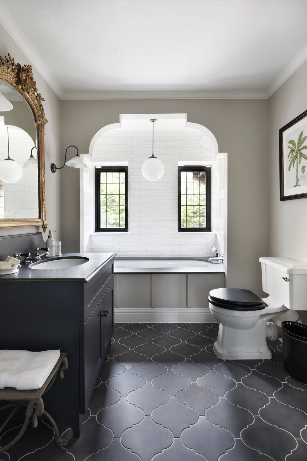 Here, the positioning of black-framed windows contributes to the bathroom’s symmetrical balance. Those units permit the sunlight to shine through too.