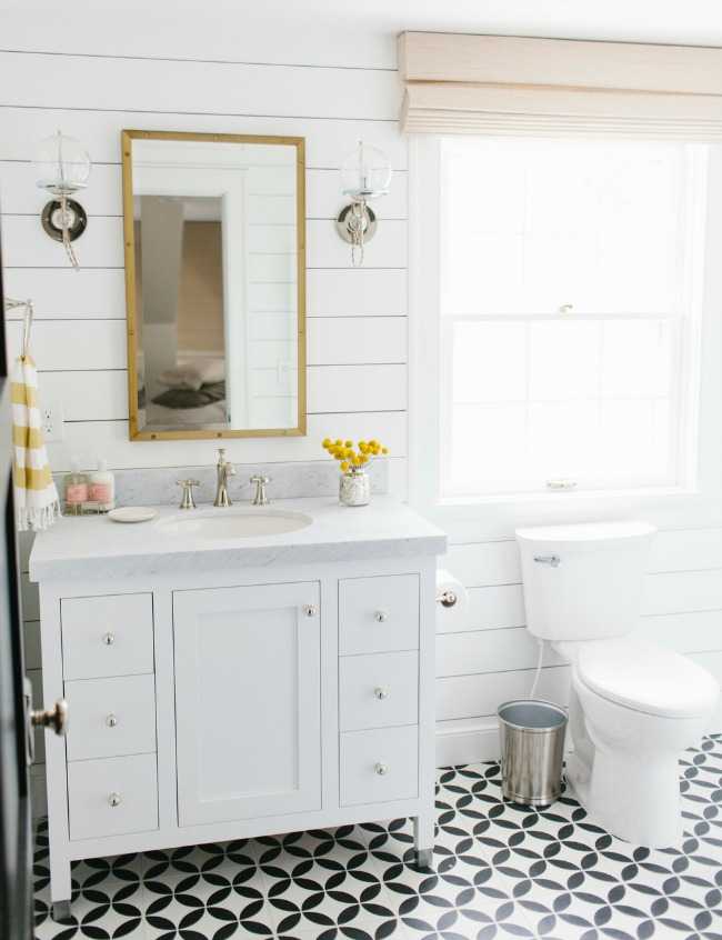 Monochrome geometric floor tiles lend this powder room a modern visual appeal. White shiplap walls and vanity open up the space. Brass accent, splashes of yellow and pastel orange let the area take a break from white dominance.