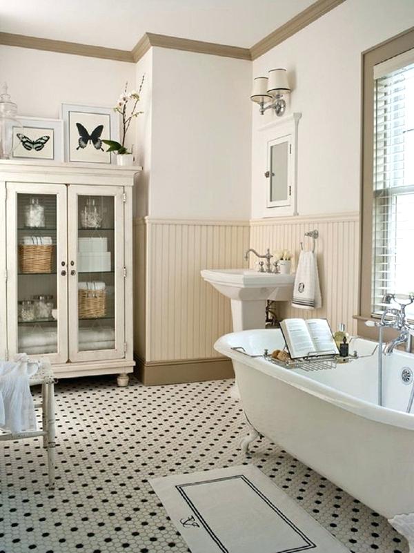 Black and white hexagon floor tiles imbue bathroom with character. Cream-painted wainscoting panels and khaki moldings calm the senses.