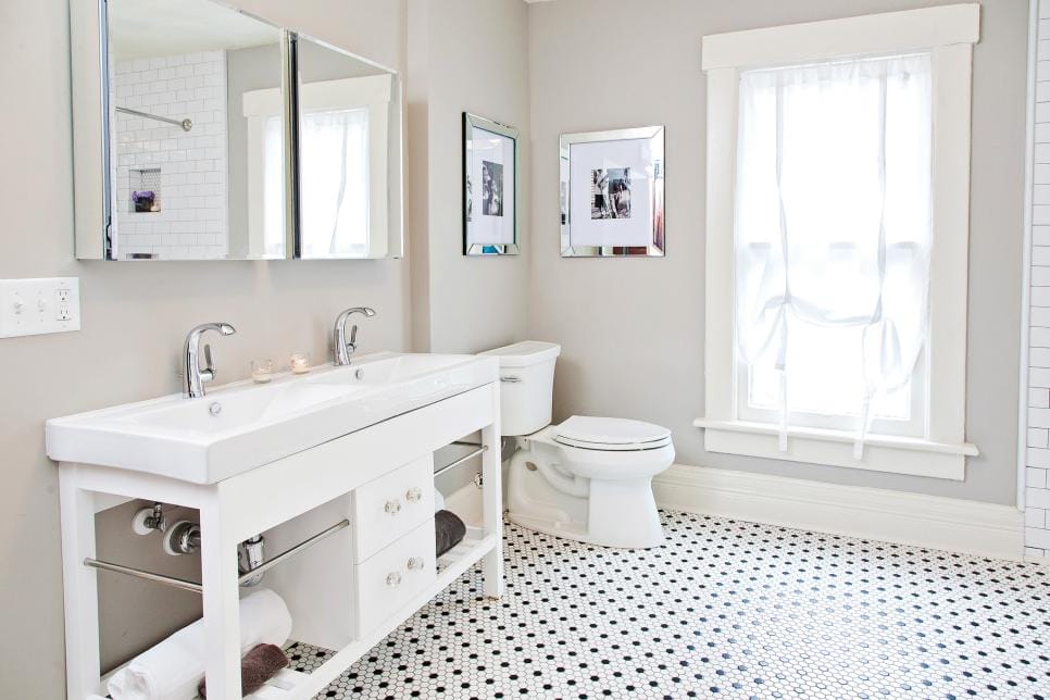Light taupe walls let black and white penny floor tiles sing out. White vanity and mirrored cabinet house bath essentials. Two mirror-framed works of art reflect the light and titivate the otherwise blank wall.