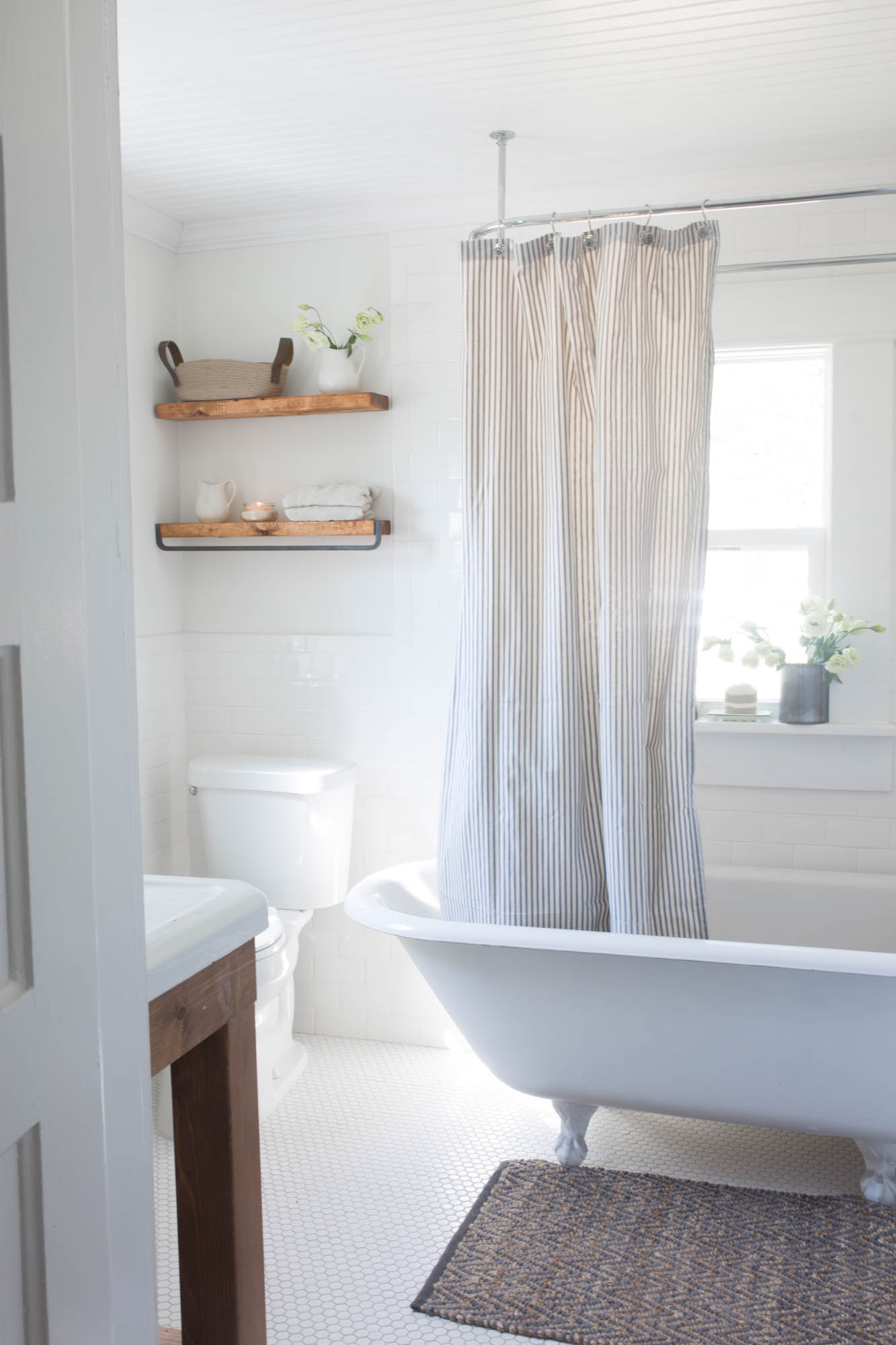 The unfinished wood vanity and floating shelves bring rustic charm to the area. A striped curtain poses a focal point and maintains the bather’s privacy.