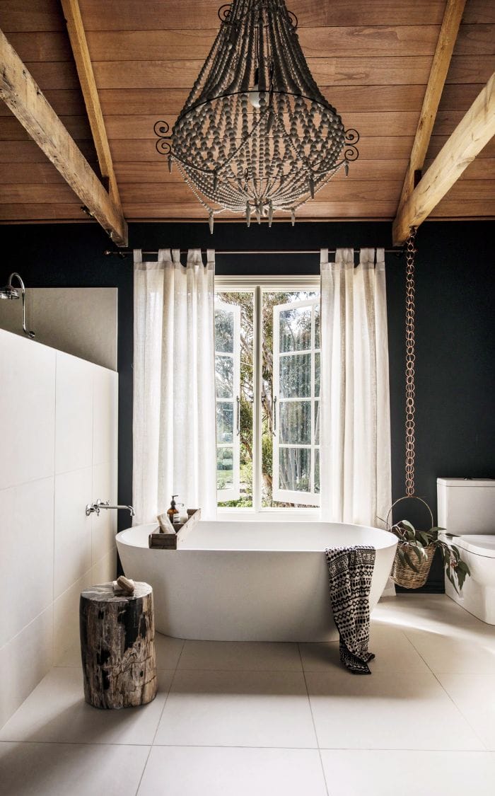 Black walls instill a sense of drama. Weathered wood stump stool, ceiling, and exposed beams result in a lived-in feel. The beaded chandelier illuminates the entire room.