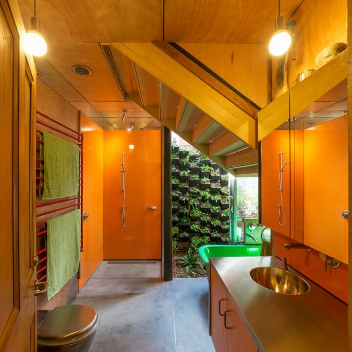 The wooden floating vanity and ceiling infuse organic warmth. In addition, they balance the concrete floor and walls out.