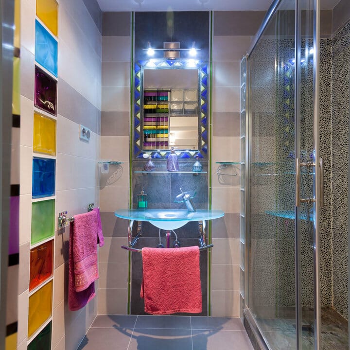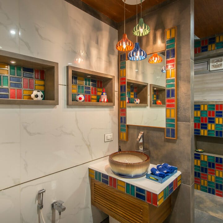 Colorful accents throughout the bathroom carve a cheerful ambiance. The cute pendant lamps brilliantly pull in the vibrant hues, while the cool white vanity top accentuates the sink bowl.