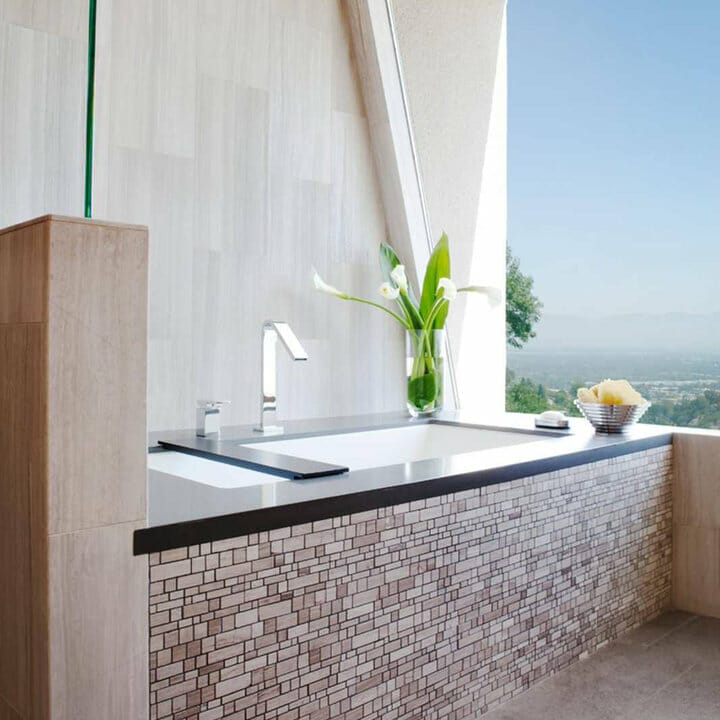 In this bathroom, the neutrals generate a spa-like atmosphere. Furthermore, the massive window enables you to enjoy the scenery while having a long soak.
