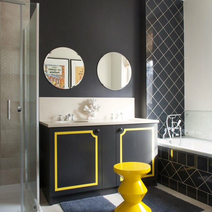 The black vanity imbues the bathroom with serious drama and sophistication. Moreover, hints of gold infuse a touch of glam.
