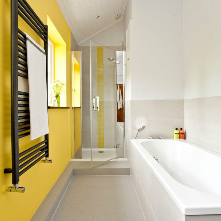 The sunny yellow wall and shower tiles evoke happiness. Moreover, the fresh blooms soften the bathroom’s look.