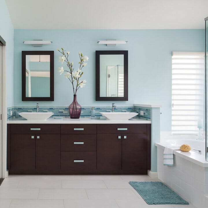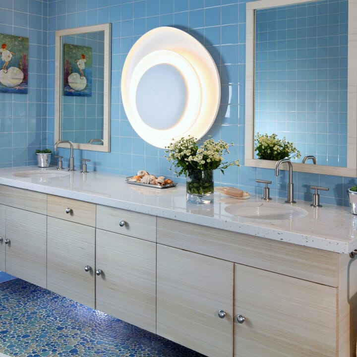 Sky blue wall tiles make anyone feel relaxed. Moreover, they meet light gray granite vanity top in a captivating manner.