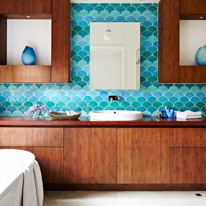 The square tiles wear turquoise and light blue shades. They emanate a beachy atmosphere, too. Lastly, the geometric teal tiles give off a modern feel.
