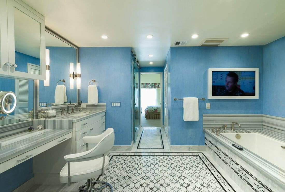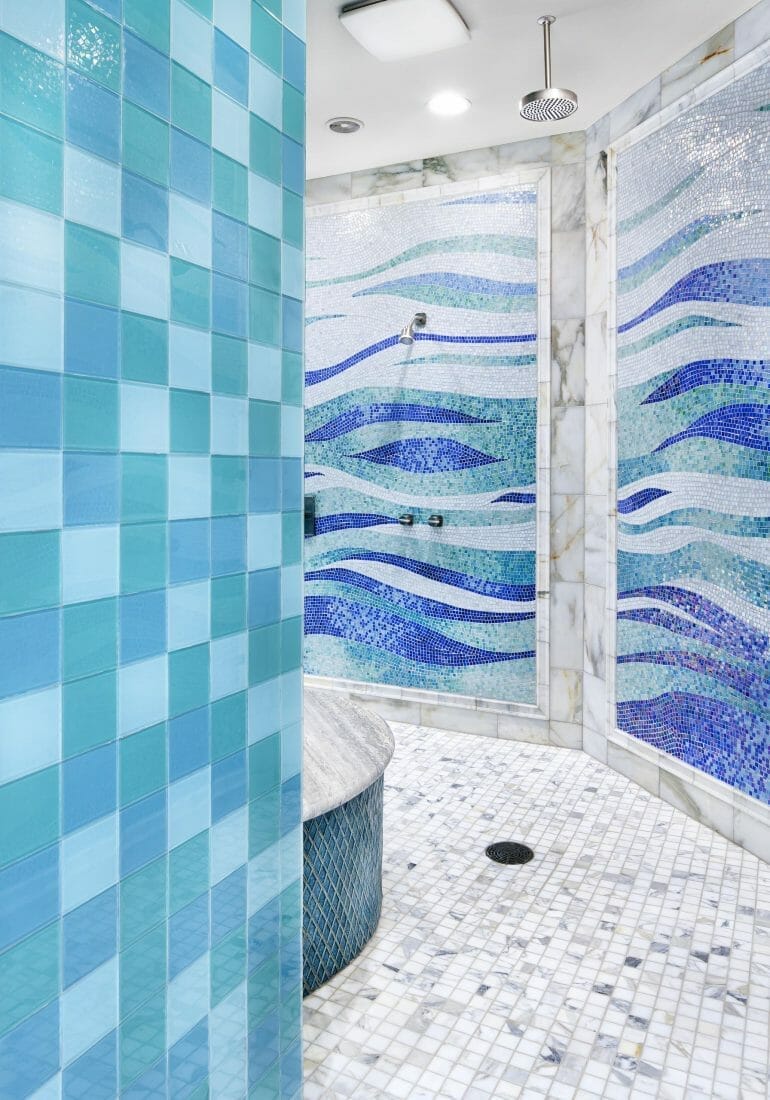 The mosaic tiles on the walls embrace varying blue shades. Furthermore, they’re surely reminiscent of lapping waves.