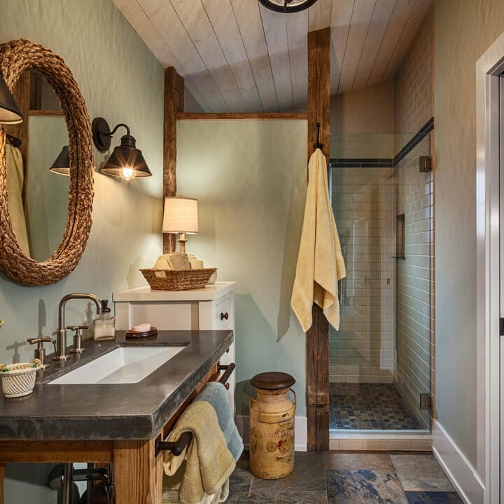 The milk jug stool exudes a farmhouse vibe. Furthermore, the limestone floor tiles and concrete vanity top offer cozy textures.