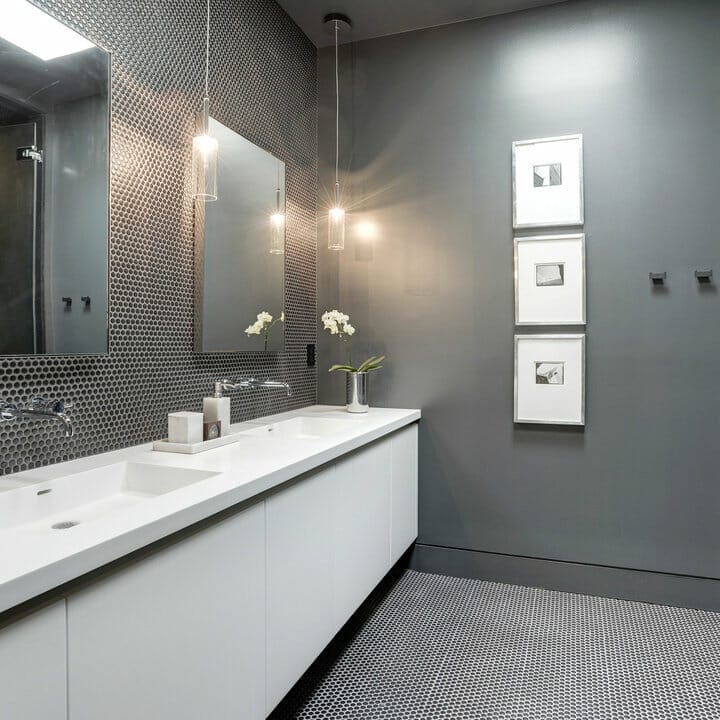 Here, light gray walls provide a clean backdrop for the white vanity and toilet. Moreover, the monochromatic mosaic tiles instantly give the bathroom a striking look.