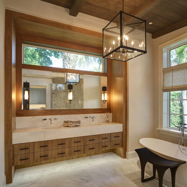 The wooden stool, floor, and accent wall lend the bathroom nature’s raw beauty. Moreover, they suddenly make the interior more welcoming.