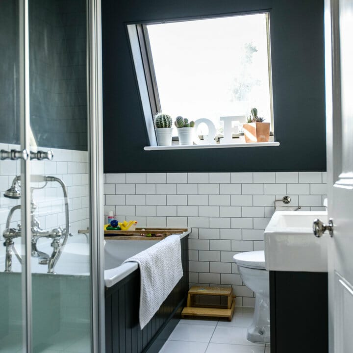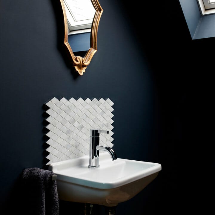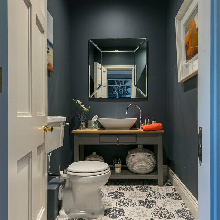 The deep navy walls provide a sophisticated backdrop and contemporary edge. Furthermore, since the bathroom boasts a cool white sink and backsplash, it doesn’t seem overly dingy.