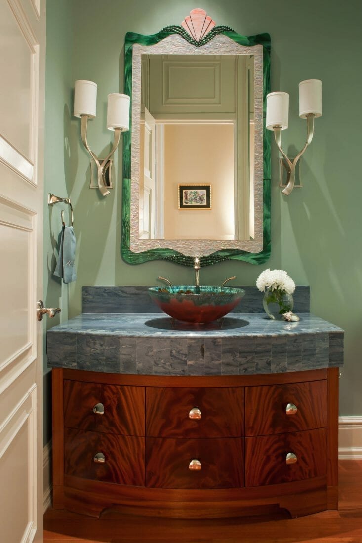 The bright green mirror does not only reflect the light but also punches up the bathroom. Furthermore, the wooden floor and vanity balance out the metallics and gray-blue marble.
