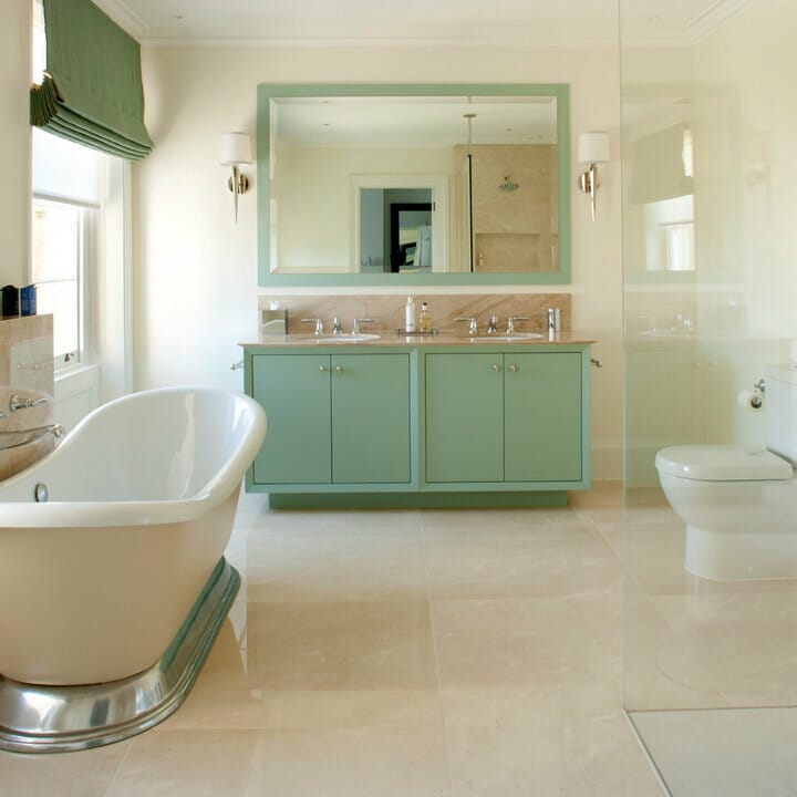 The mint green mirror frame and vanity create a fresh yet fun look. Moreover, bright whites and beiges mix well with the subdued green window shades.