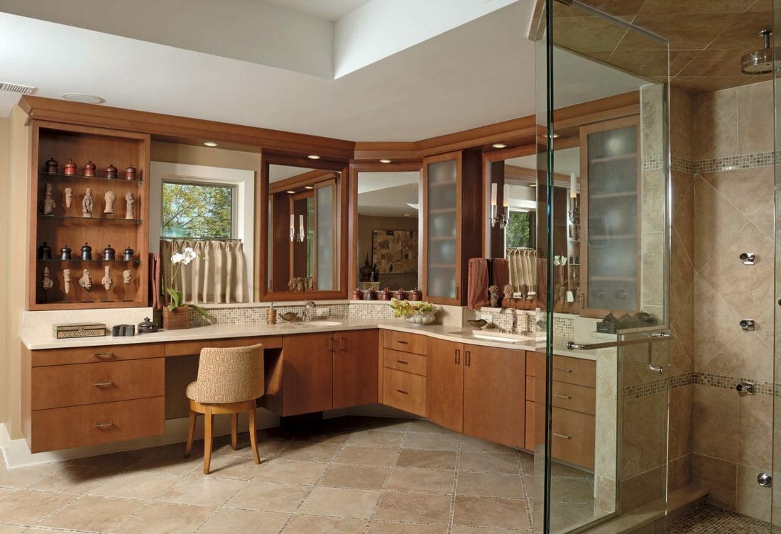 The medium-toned wooden vanity and square shelves ooze warmth. Meanwhile, the white sink and tub maintain the bathroom’s open feeling. Lastly, the pale taupe floor inspires serenity.
