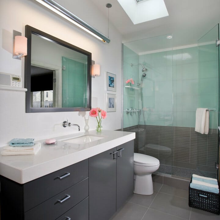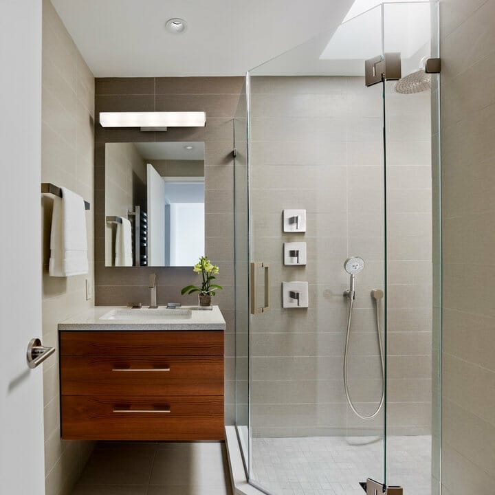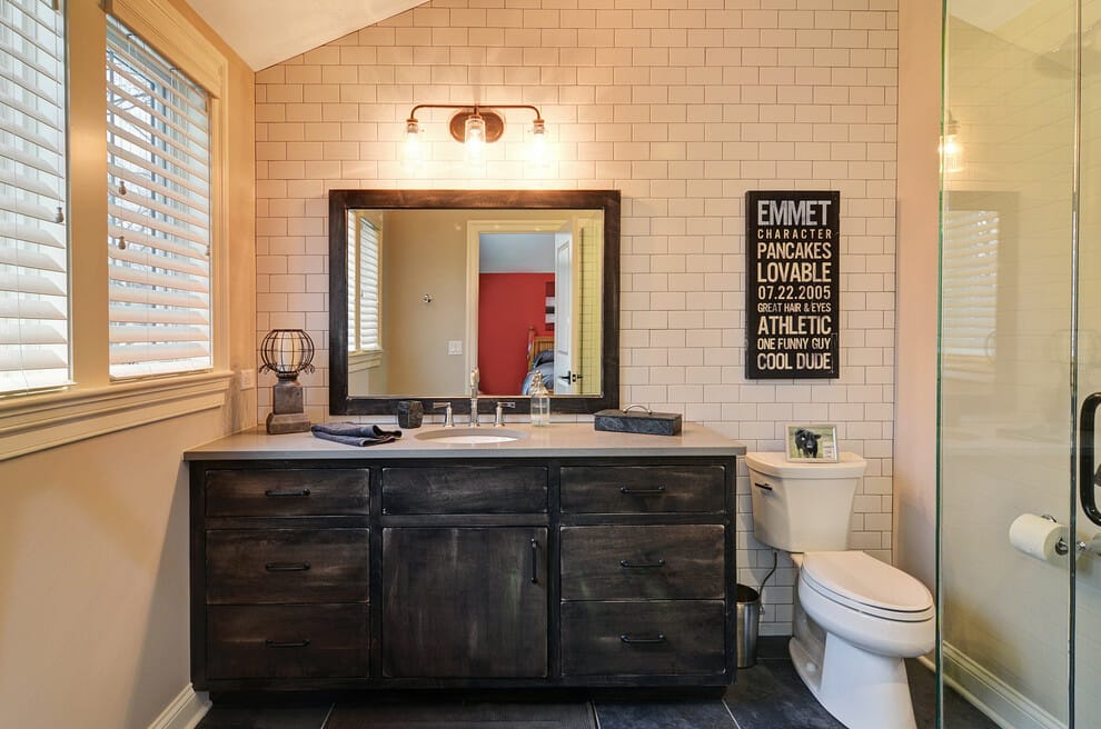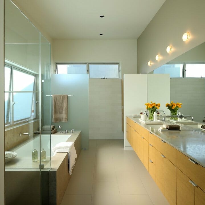Speaking of the placement of vanity light over mirrors, these lights don’t extend beyond the wooden vanity. Due to them, the interior doesn’t lack visual balance at all.