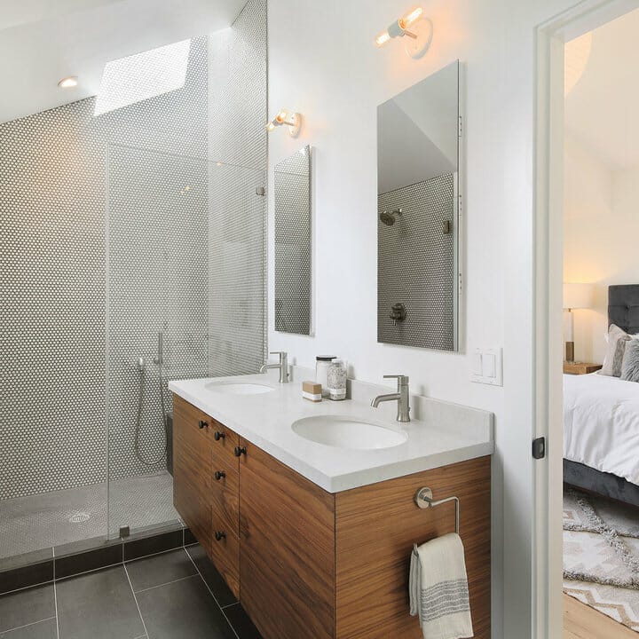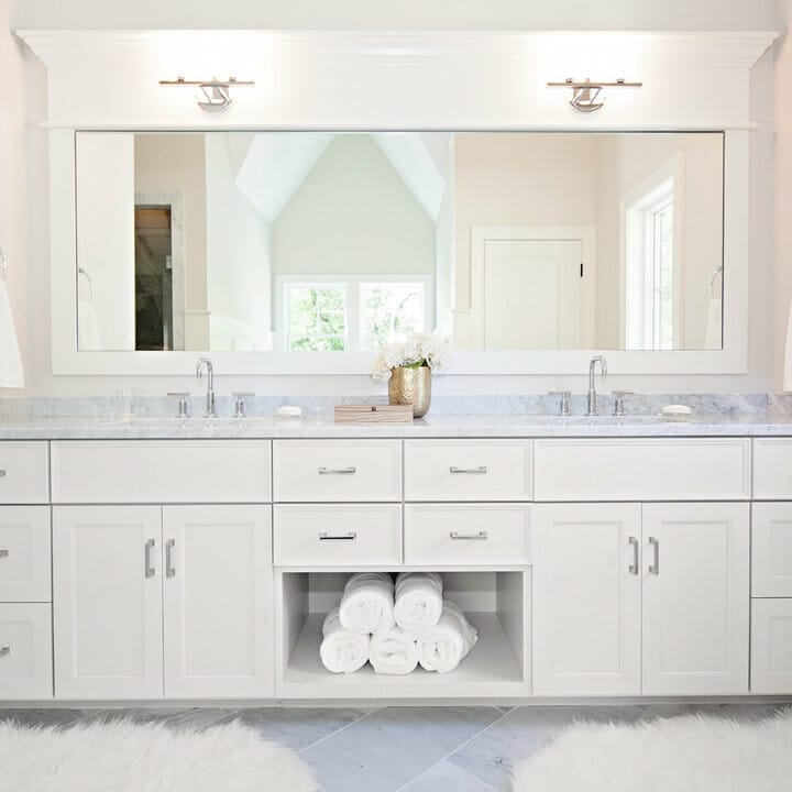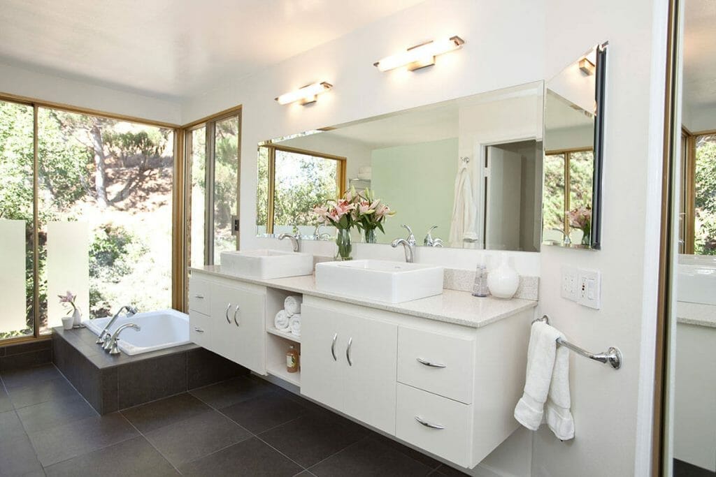 Since the vanity comes with circular sinks, it keeps morning fights at bay. Furthermore, the simple wall sconces highlight the narrow yet trendy mirrors. Also, their warm glow balances out the white backdrop while offering task lighting.