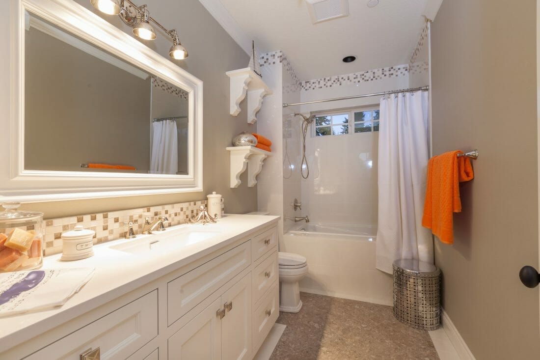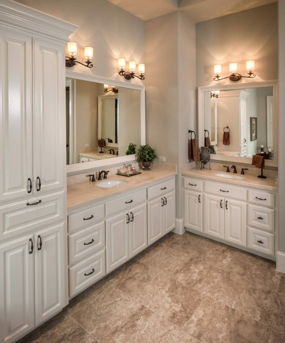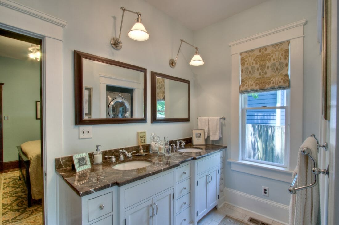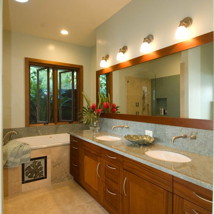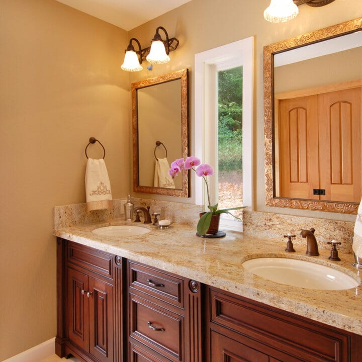 Since vintage wall sconces introduce a relaxing glow, they fit in with the beige backdrop. Also, they direct the homeowner’s eye to the granite double sink vanity. Moreover, the narrow window and orchid keep things balanced.