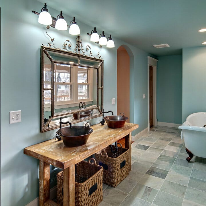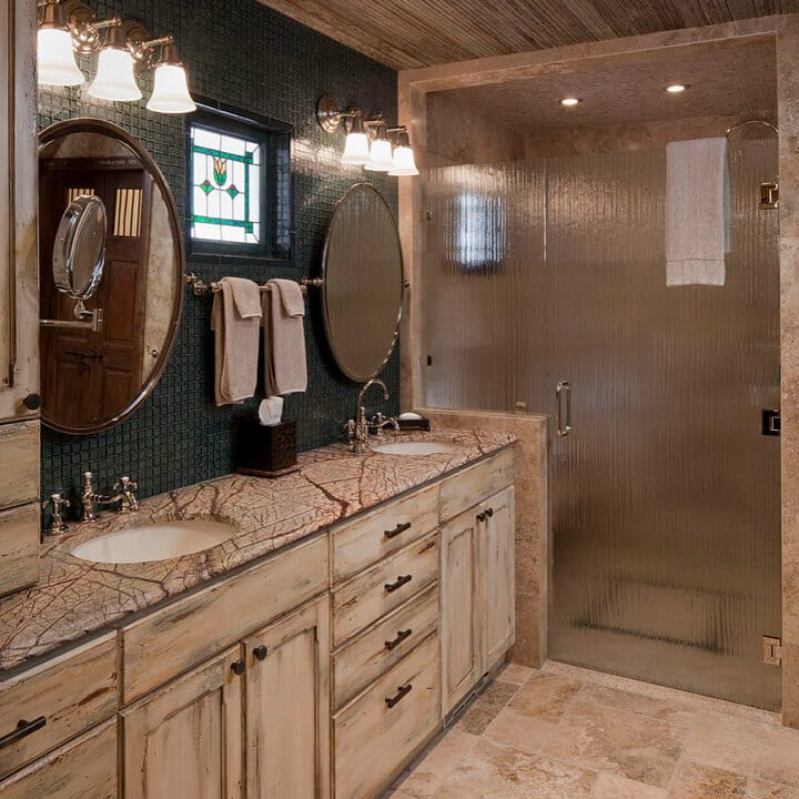 Due to vintage sconces, the homeowner and his spouse can do some hairstyling together. Also, they emphasize the wooden vanity and mirror. Lastly, botanical-inspired accents evoke visual cohesion.