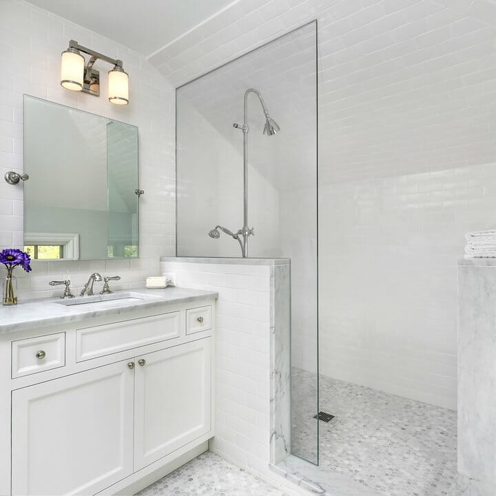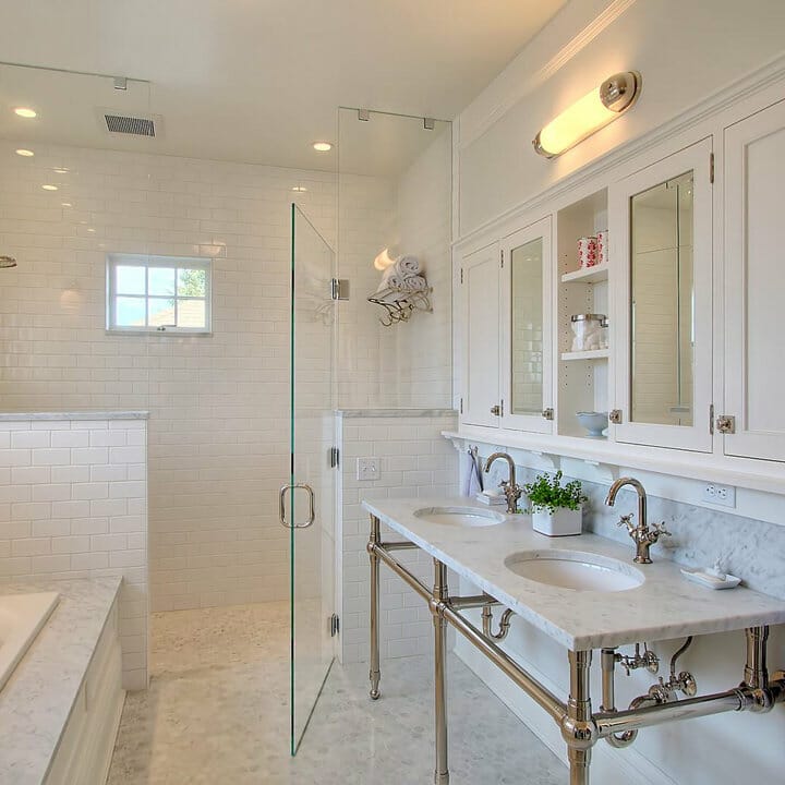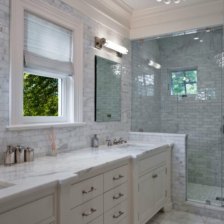 This bathroom embraces marble at its best. Here, the material adorns the flooring, vanity top, and walls while emanating a luxurious feel.