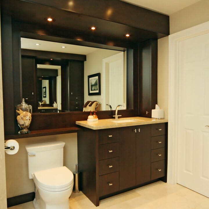 Without a doubt, huge mirrors need multiple lights. This magnificent powder room, for example, features a few downlights above the dark wood vanity and toilet.