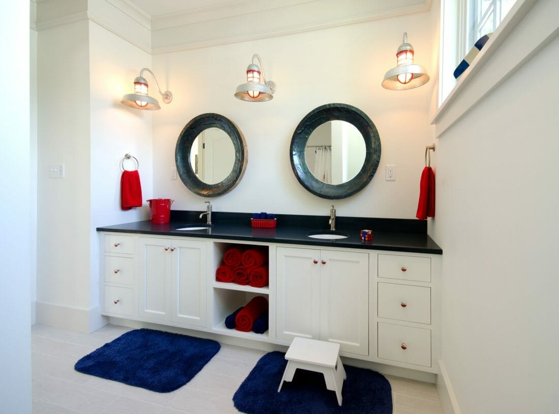 The cage wall sconces above circular mirrors carry a touch of playfulness. Moreover, navy and red accent pieces perk the kids’ bathroom up.