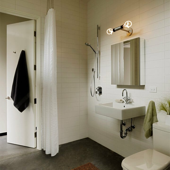 If your space isn’t enormous, consider bathroom lighting ideas over mirrors. Here, the tube wall sconce lends the spa-inspired bathroom a retro flair. Also, it ensures the interior stays sleek and inviting.