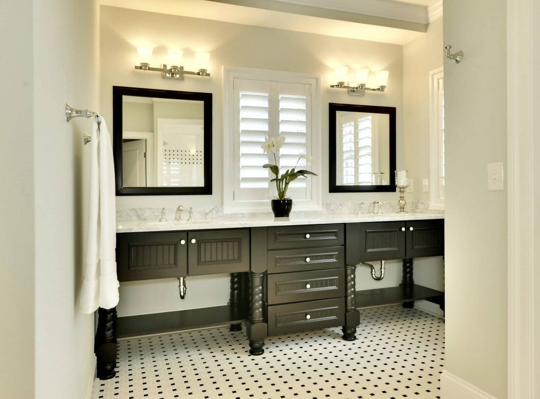 Instead of installing a full-width mirror, the homeowner opted for two narrow mirrors. Their black wooden frames deliver style and drama.