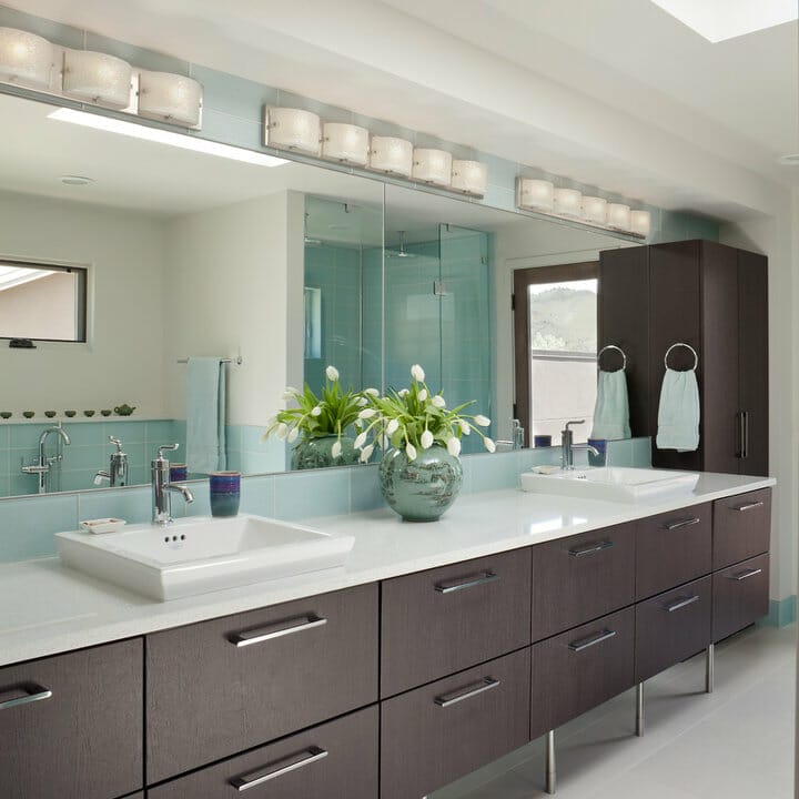 Undoubtedly, multiple bathroom lights are perfect for long vanities. Here, four silver wall sconces ensure the double sink vanity receives proper illumination.