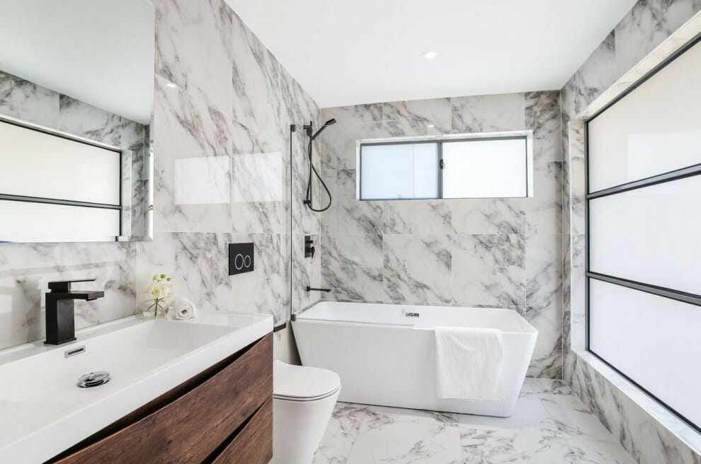 Even better, if they come in a harmonious color. However, marble is a bit pricier than porcelain. In that case, you can install it for the countertop in your vanity sink and leave the others with porcelain tiles.