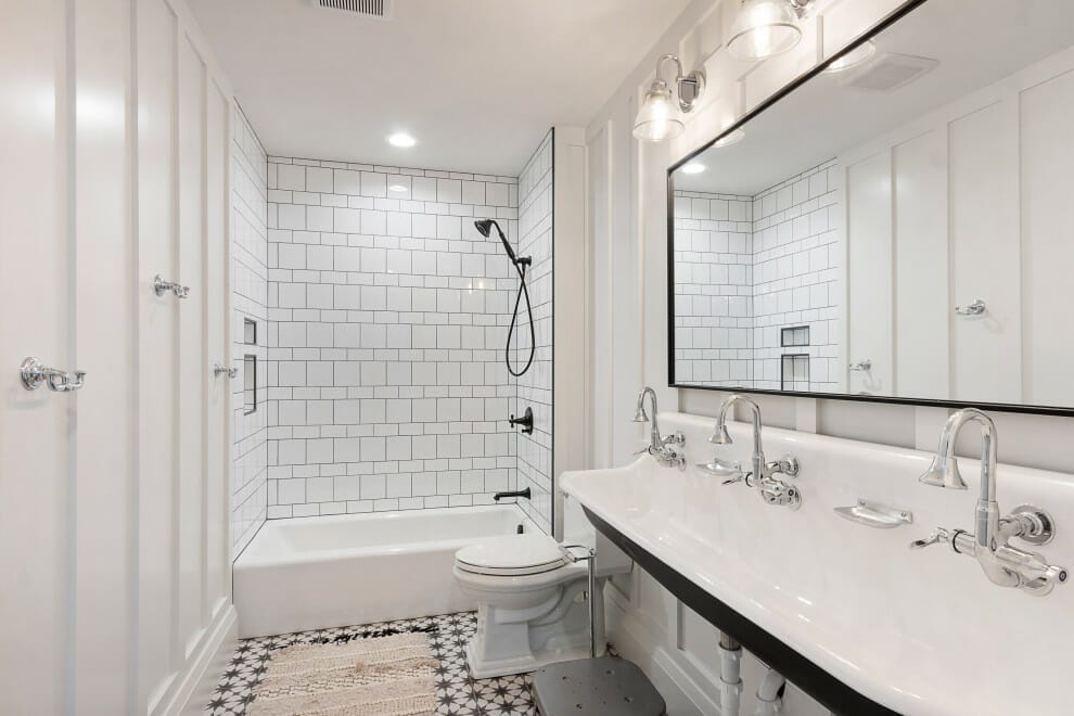 Suppose you are a retro-style lover but still don’t want to get rid of the modernity inside the bathroom. In that case, you are better off going with geometric tiles as above.
