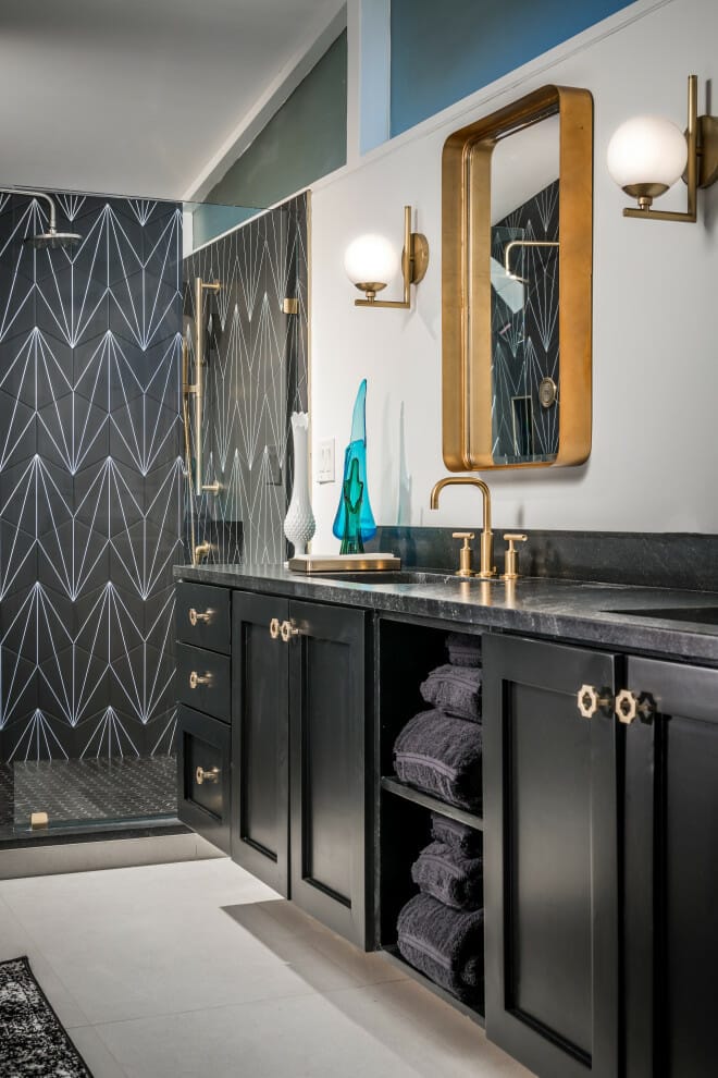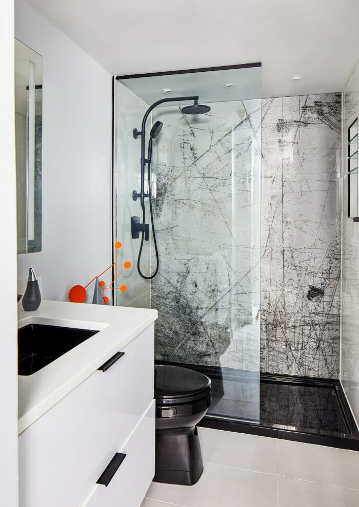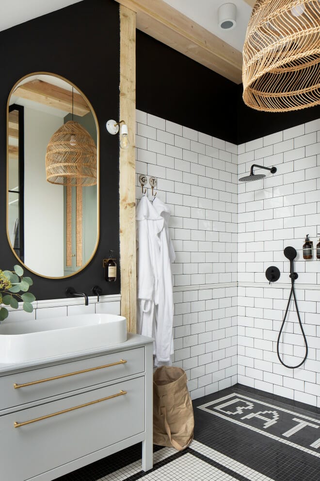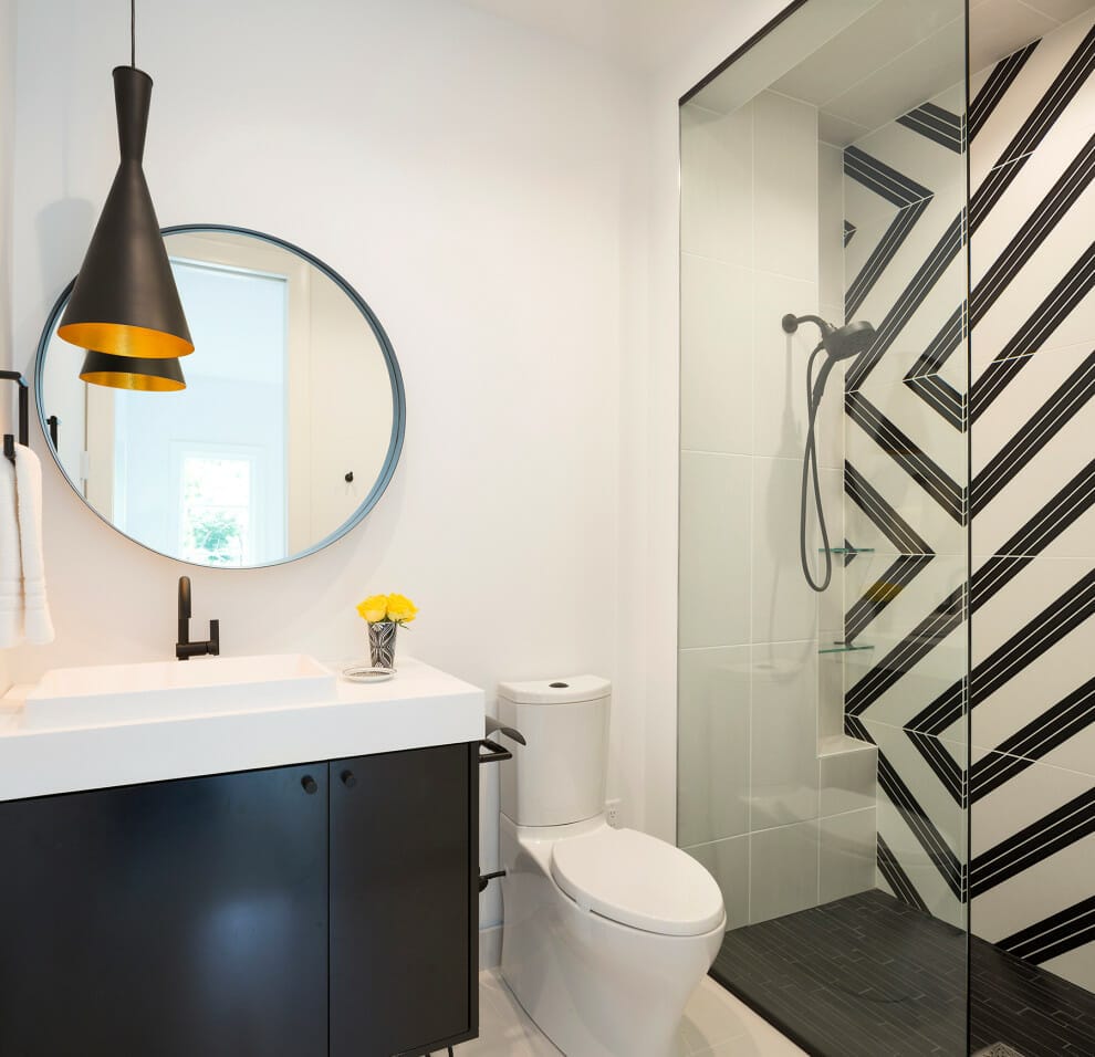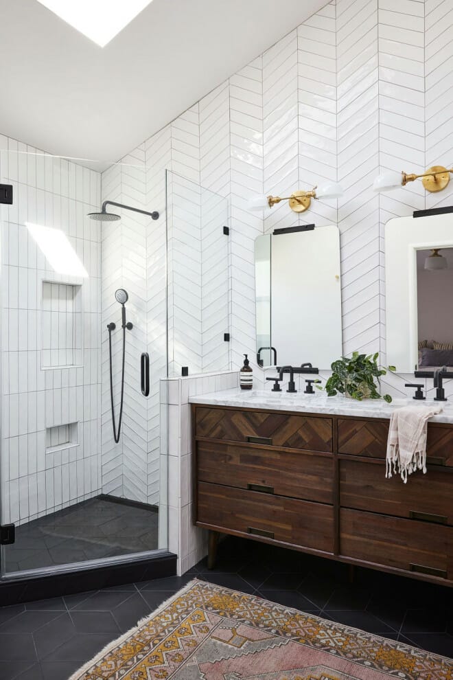 The multi-shaped tiling system in the bathroom is an alternative option if you want to give your bathroom personality without going with striking colors.