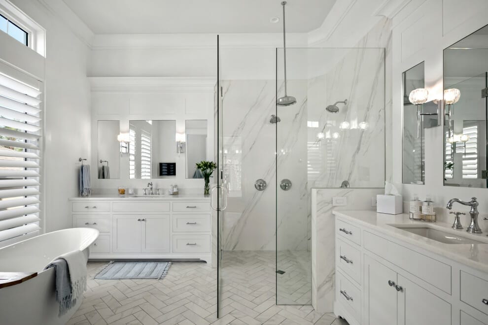 However, don’t forget to give it a little texture, for example, marble tiles for the splash zone wall tiling and geometric tiles for the flooring to create depth in the bathroom further.