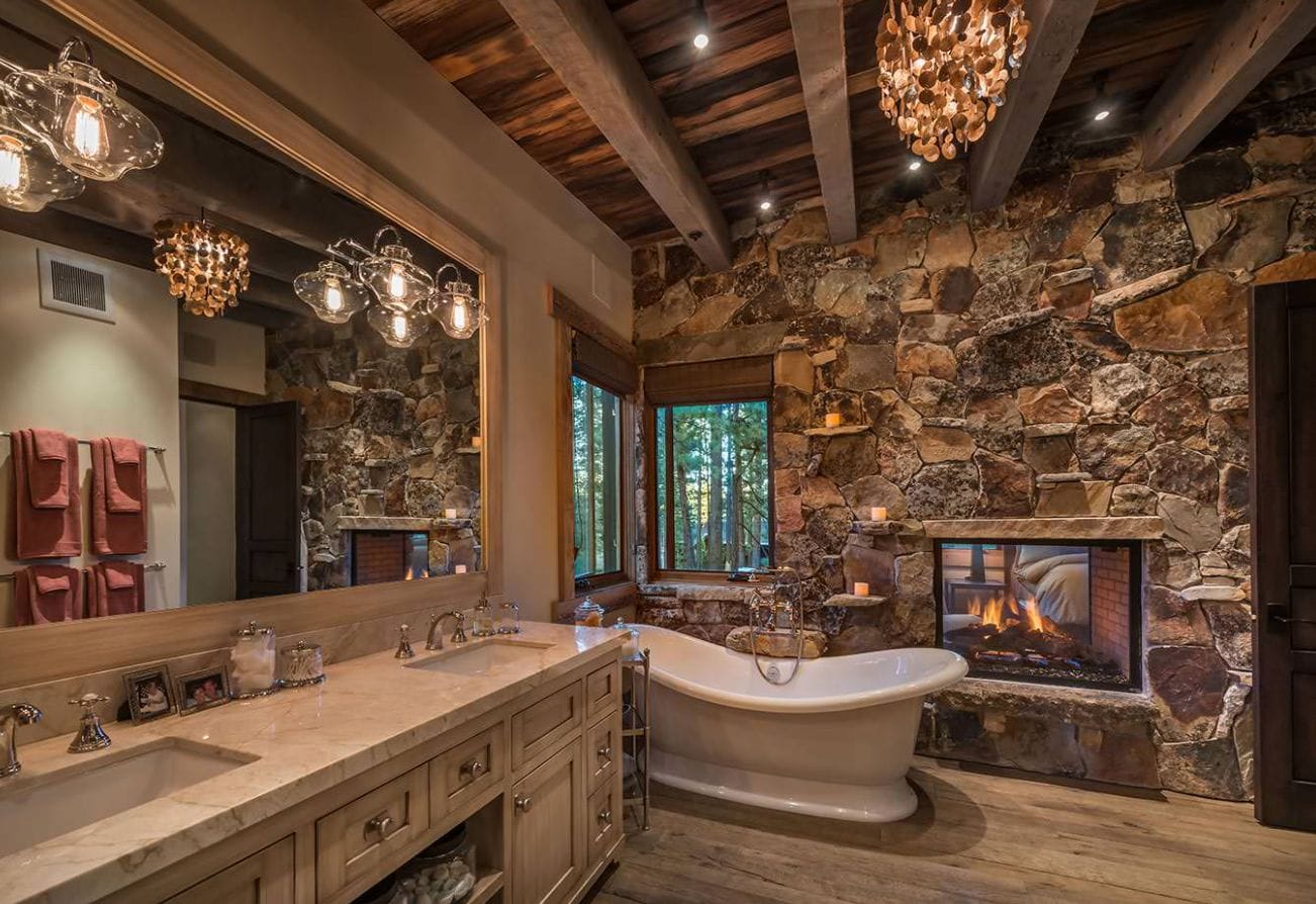 Rough stone wall awesomely meets reclaimed wood floor and beams. White and cream units lighten up the cabin bathroom. Stone floating shelves hold scented candles. The chandelier and glass sconces cast a romantic glow.