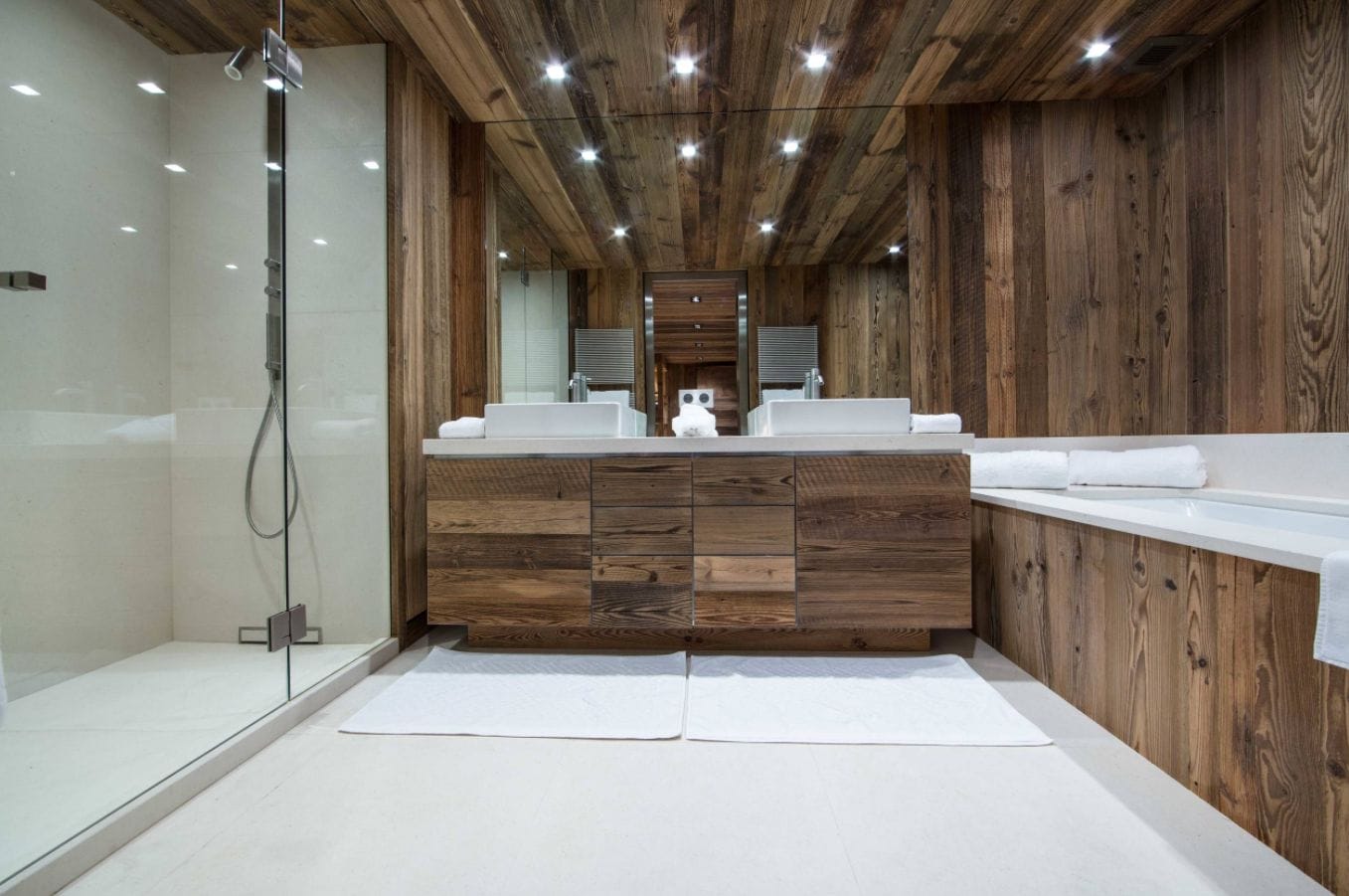 Raw wood beams and stone brick walls introduce rough textures. Large windows allow the bather to see a breathtaking outside view.