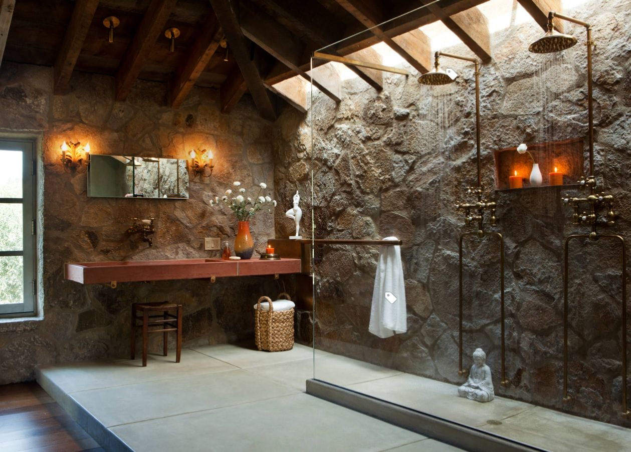 Flagstone walls, wood beams, and weathered iron sconces lend the bathroom a country rustic appeal. Polished concrete floor tiles and a glass panel elicit the city’s slickness. Statuette and flowers in vase finish things off.