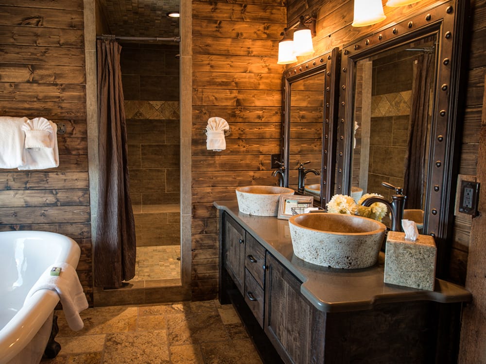 Reclaimed wood vanity, polished stone tub, and sinks make the homeowner get closer to nature.