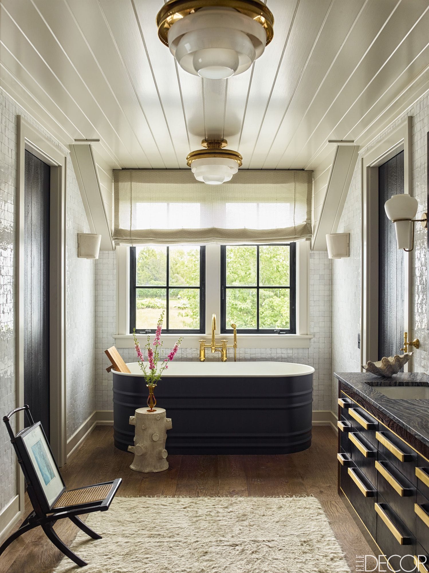 The off white shiplap ceiling and window blind imbue the bathing space a serene atmosphere. Gold details bring a touch of luxury to the room.