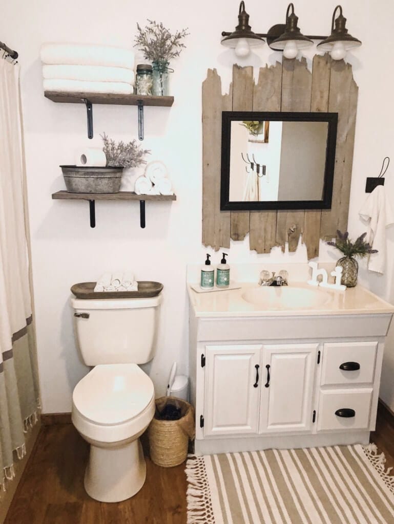 The rustic bathroom decor features a mirror that is framed with weathered lumber, which makes it look like an old window. It’s great for storing perfume bottles and other items away from the sink area where they can be easily accessed by your guests. The box also provides some extra storage space in small bathrooms as well as adding color to this masculine room thanks to its flowery design!