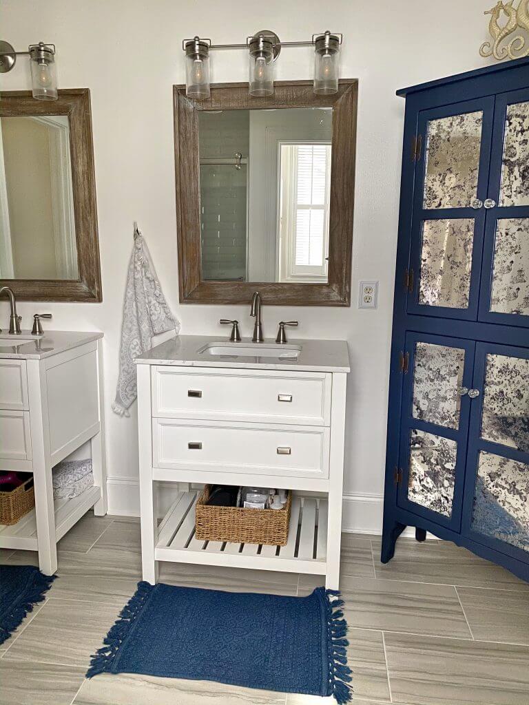 With the sleek metal industrial vanity lights, rustic wood framing your mirror and corner cabinet that holds all of your bath time essentials in tow, you can’t go wrong with this family bathroom. The color combination of white, blue, and distressed gray is a perfect match for these modern yet classic decor styles!