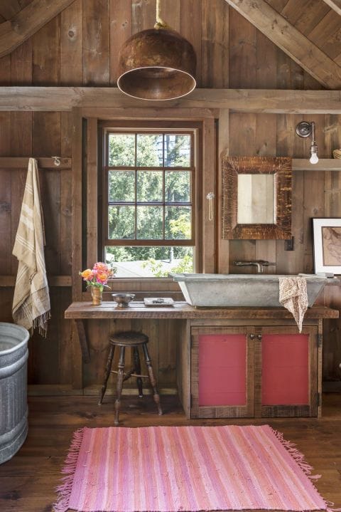 This modern rustic bathroom is designed to keep the natural elements in mind, with herbs and wood finishes. The wooden shelves overhead create a cozy feel while adding character to this room. A simple mirror on an old board wall captures your attention only after you make your way over to see what’s behind it – beautiful!