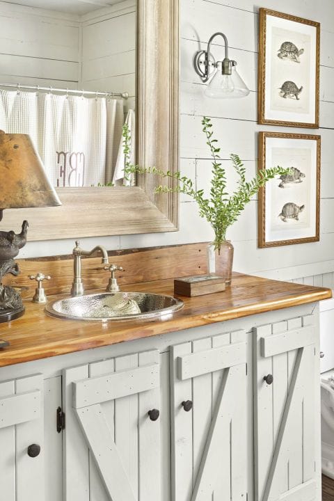 Use a soft color on both the walls and cabinets to create an inviting space with country charm. The wood counter gives this rustic bathroom character, while detailing sets off the look nicely.