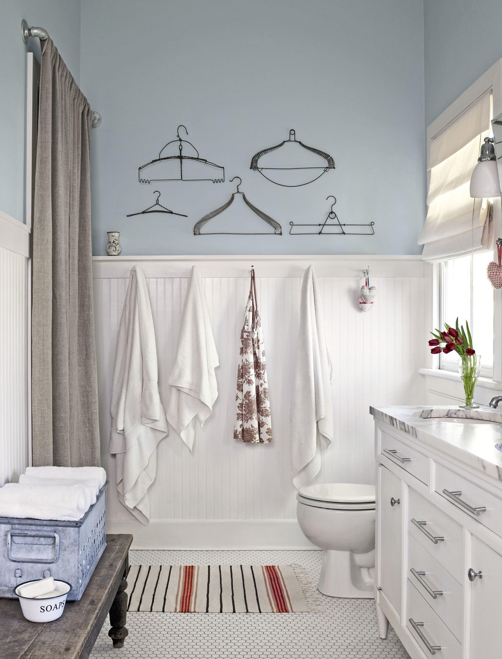Have you ever thought about how old timey hangers might make a bathroom feel more homely and warm? Why not try hanging them up on the wall next to some modern hooks, like so!
