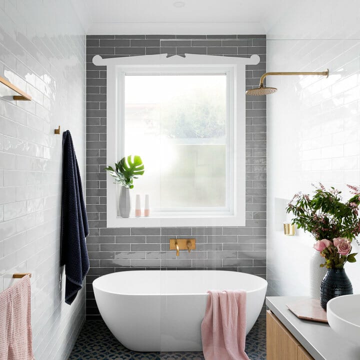 Gray subway tiles with white grout make a great backdrop for the bathtub.