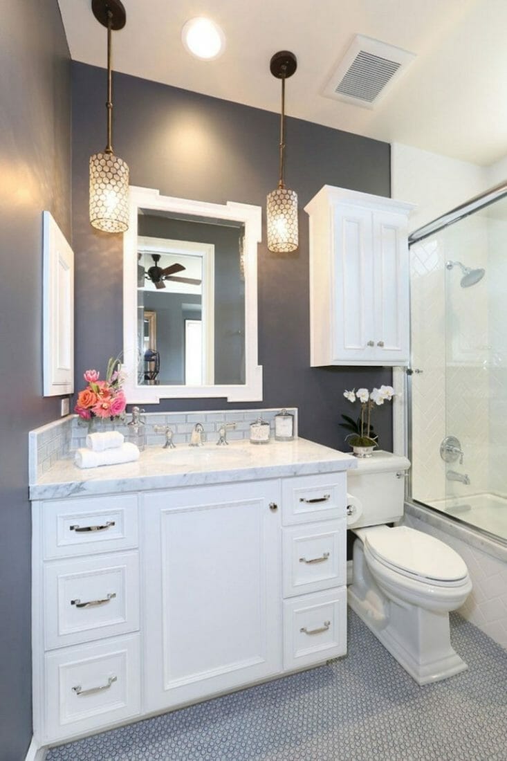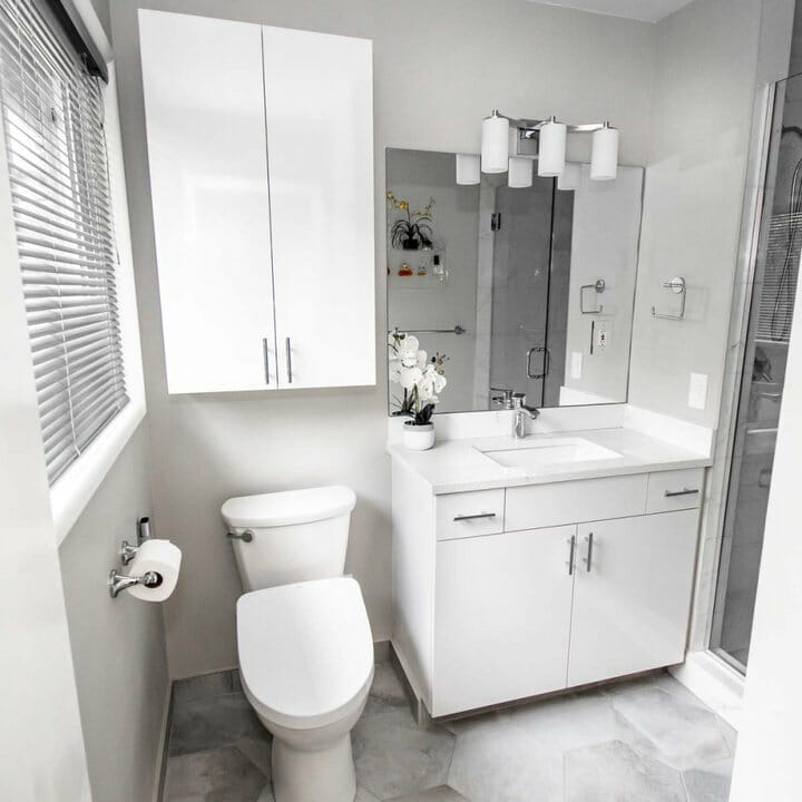 White and gray conquer this small bathroom, which makes it look larger. You can take this idea to the next level by investing in sleek cabinets and forgoing the mirror frame. This way, you can get the trendy style.